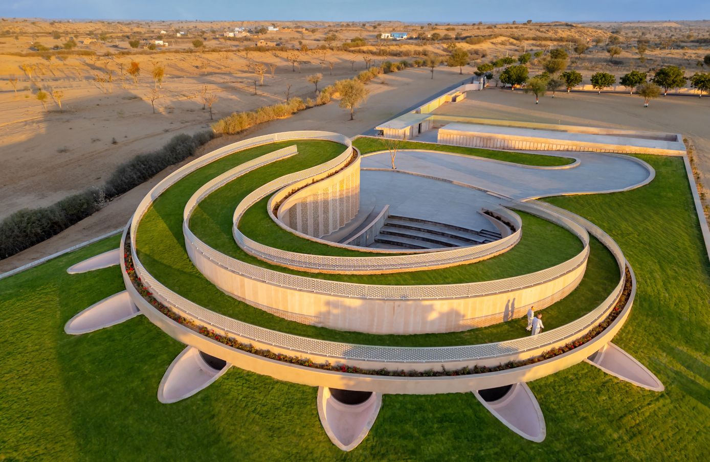 Nel deserto del Thar, dove per otto mesi l’anno le temperature sfiorano i 40°C, il Nokha Village Community Centre, progettato da Sanjay Puri Architects, emerge come architettura capace di restituire dignità e futuro a una comunità diffusa in 144 villaggi rurali. Pensato come monumento commemorativo e come infrastruttura culturale, il complesso intreccia memoria e innovazione attraverso una geometria spiraliforme che sembra scolpita dal vento. Il grande giardino pensile di oltre 9000 m², l’anfiteatro all’aperto, il museo e soprattutto la biblioteca per bambini definiscono un luogo d’incontro raro e necessario, capace di mitigare il clima ostile e ampliare le possibilità di apprendimento e socialità .